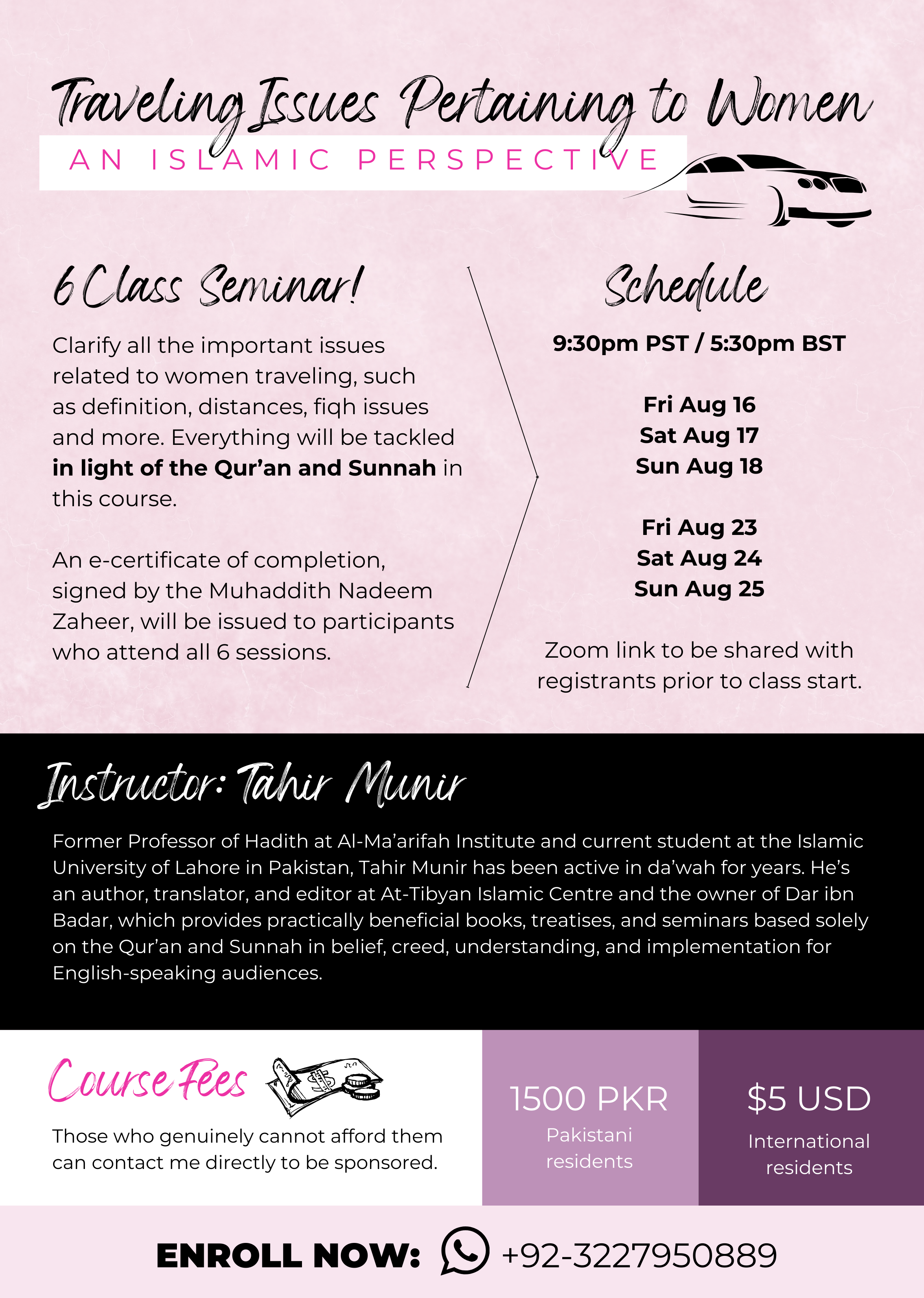 6-class seminar covering issues that frequently come up regarding traveling for Muslim women. E-certificate signed by Shaykh Nadeem Zaheer issued to attendees present for all classes.